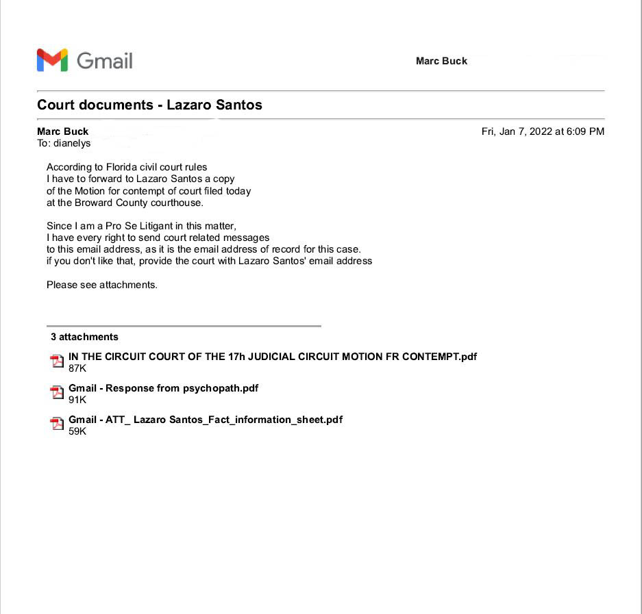 her in an email. I also told her that I had filed a Motion for Contempt of Court, and explained to her the ramnifications of that Contempt order, which could land her