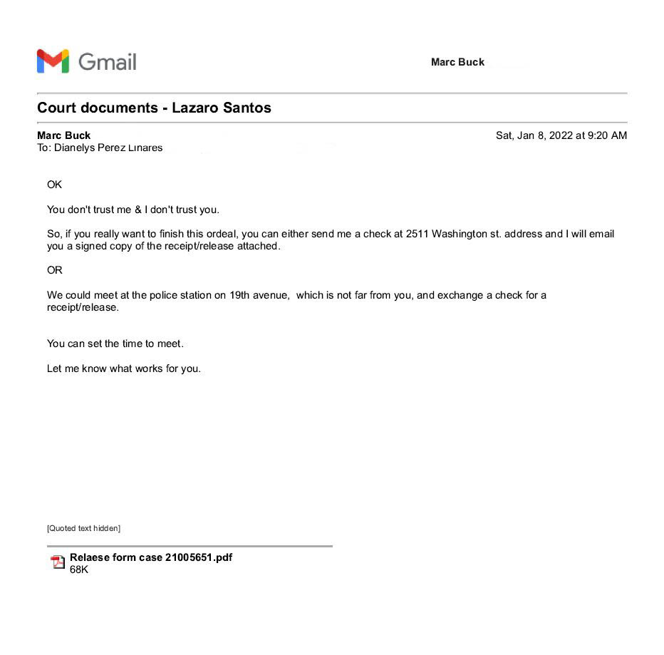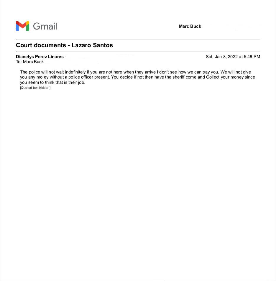 So, I started to approach them to swap a check for a realease of claims. As I got closer, Lazaro the Bozo, started freaking out, with his hands out, as to keep me