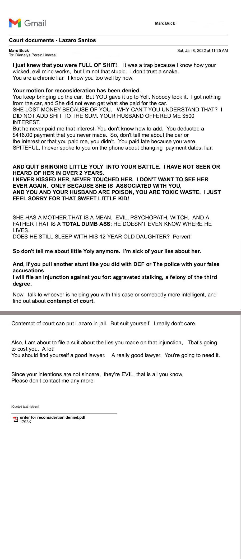 it. But, the blowhard that she is, she responded sarcastically, saying that she had told me not to contact her at that email address. She insisted that the judge had not responded to