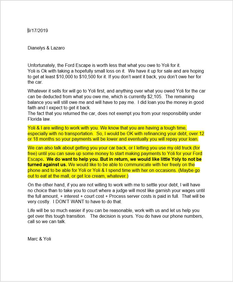 that they gave up the car to Yolanda as they still owed her $10,000 on the car. Unfortunately, as I explained to them in a letter, the car did not cover their