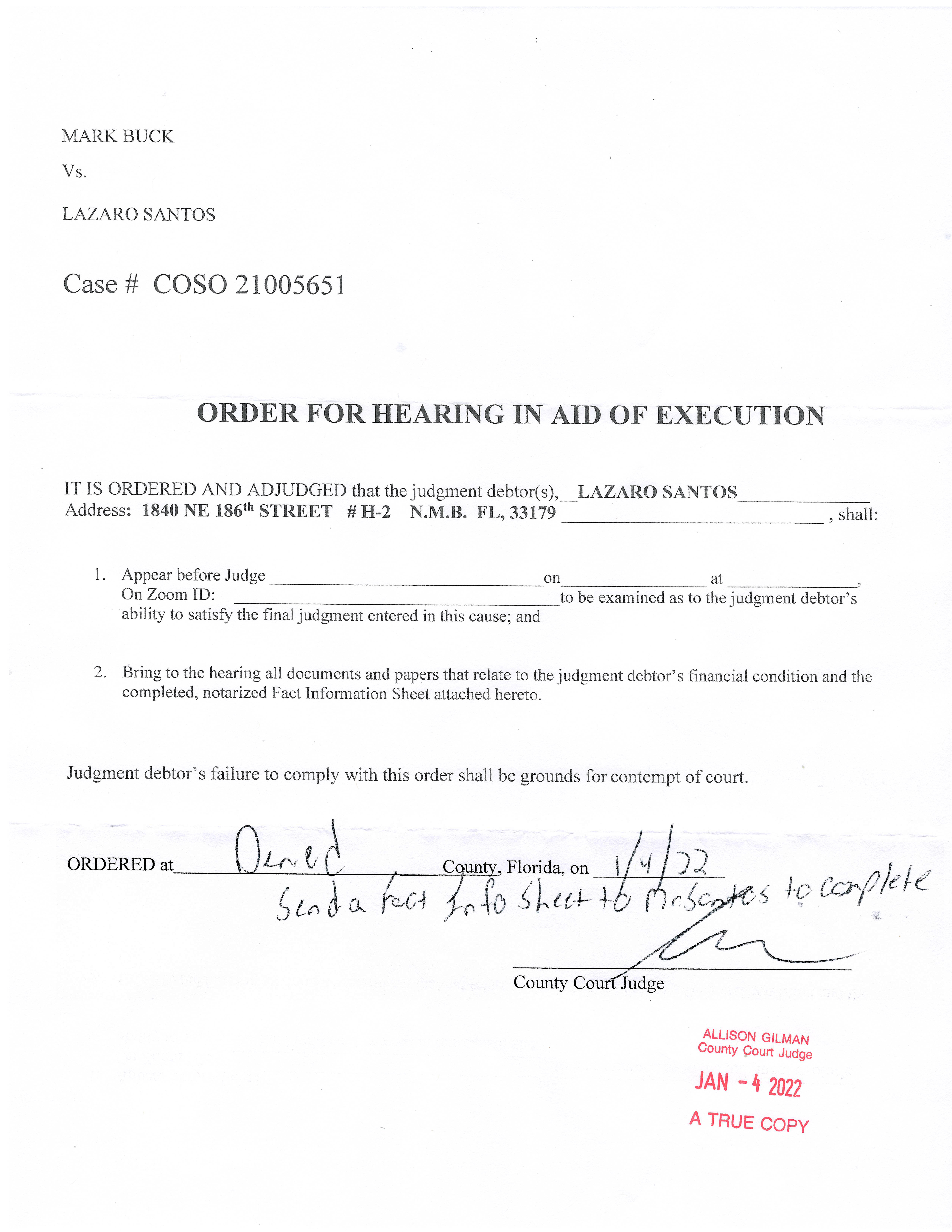 Today, my Motion for a Hearing for Aid in Execution was Denied. But, at the bottom of the motion, was a notation that said: Send the Fact Information Sheet to Mr Santos to complete.