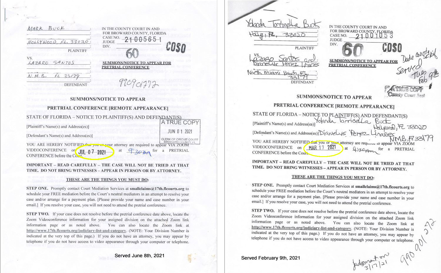 were served by the Dade County Sheriff on June 8th, 2021 at 8:00pm.